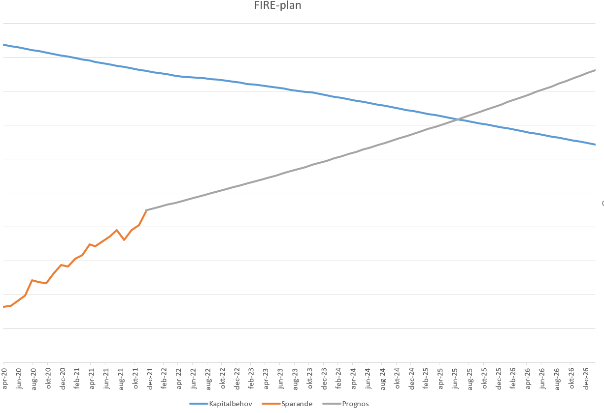 Den blå linjen är kapitalbehovet vid varje tidpunkt. Orange är nuvarande kapital. Grå är prognos (+8% per år+nysparande)