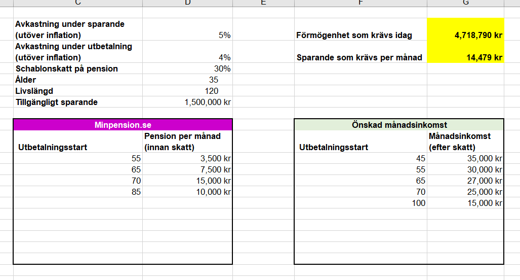 Jo… jag har också gjort min egen. Tråkigt bara att alla hänvisar till Minpension.se när den inte är användbar för perioden 70-80 år om man väljer att låta delar av tjänstepensionen växa till sig.
