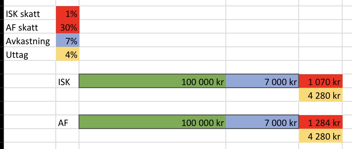 Det enda jag kan se är att om den totala avkastningen är mycket hög, så kan skatten bli högre på AF än på ISK. Men i det fallet, har man ändå vunnit spelet och har mycket mer pengar än man räknade med! Det ter sig mycket mer viktigt att minimera skatten (och därmed totala kostnaderna) för utfallen där börsutvecklingen är mer måttlig.