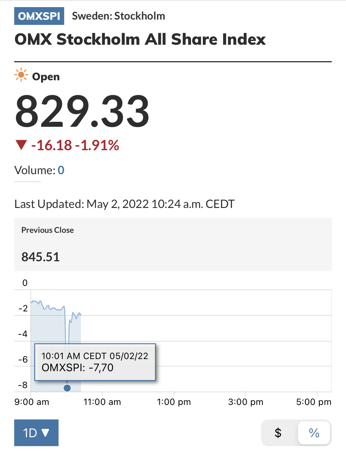 Jag har bevakning uppsatt där jag får en ljudnotis om börsen rör sig mycket. Många gånger innebär det att en stor händelse har skett i världen och då vill jag veta det direkt. Just denna gången hade jag dock inte hörlurarna på mig så missade notisen och kikade istället på grafen av en händelse. Jag har alltid en realtidsgraf i bakgrunden när jag jobbar. Så nördig är man.