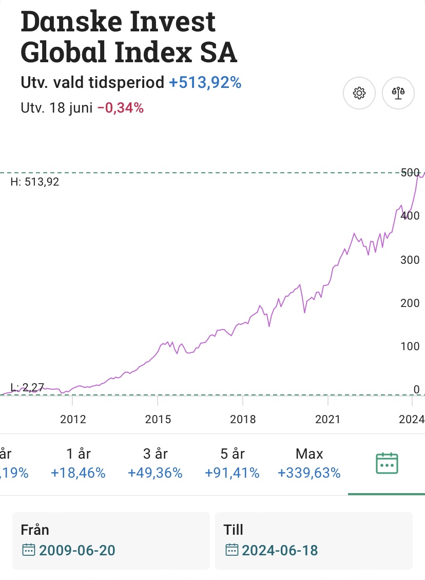 Om jag tar en globalfond som funnits längre tex Danske Globalt index så är den upp 514% = 6,14 gånger på 15 år vilket ger en CAGR = knappt 13%