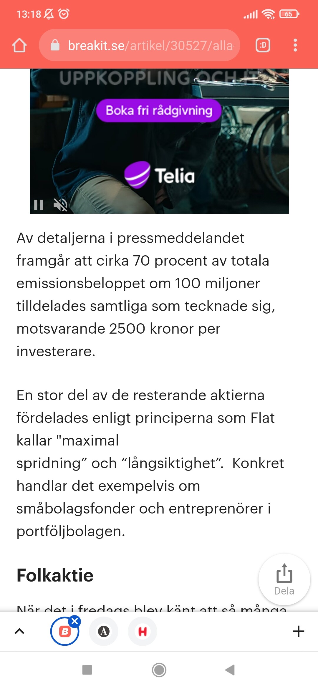 - Cirka 69,0 MSEK eller cirka 70 procent av totala emissionsbeloppet tilldelades till samtliga som tecknade sig, genom en post motsvarande 2500 SEK per investerare. Därmed har Flat Capital fått över 27 000 nya aktieägare.