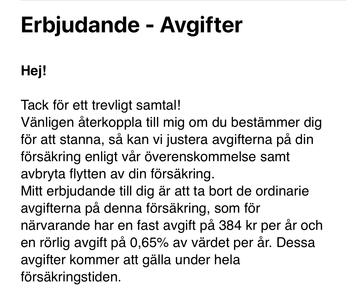 Jag har tänkt att flytta min pensionsförsäkring till Lysa och blev då uppringd av min bank inför flytt och de kommer med erbjudande enligt bilden. Känner lurt i mossen. Hur ska jag tänka nu kloka människor?