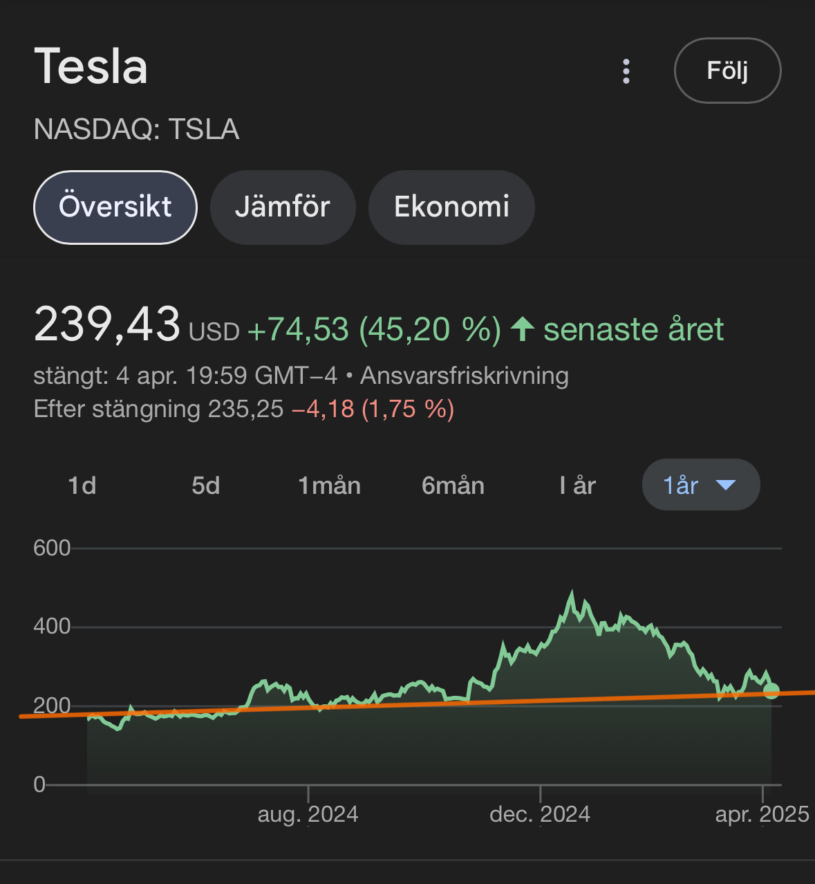 Tesla är fortfarande upp 40% senaste året och allt talar för att de kommer ha det tufft framåt. Försäljningen går trögt. Trump är toxisk för halva världsbefolkningen.