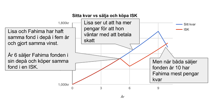 Jag håller helt med dig att det är korkat att byta till samma eller en liknande fond. I mitt exempel gjorde jag bara det för att belysa vad hävstångseffekten är för något. Alla på RT-forumet vet att det är lönsamt att byta ut dyra och dåligt diversifierade fonder mot globala indexfonder med låg avgift och lägga dem i ett ISK-konto. Men det var inte det jag ombads att utveckla.