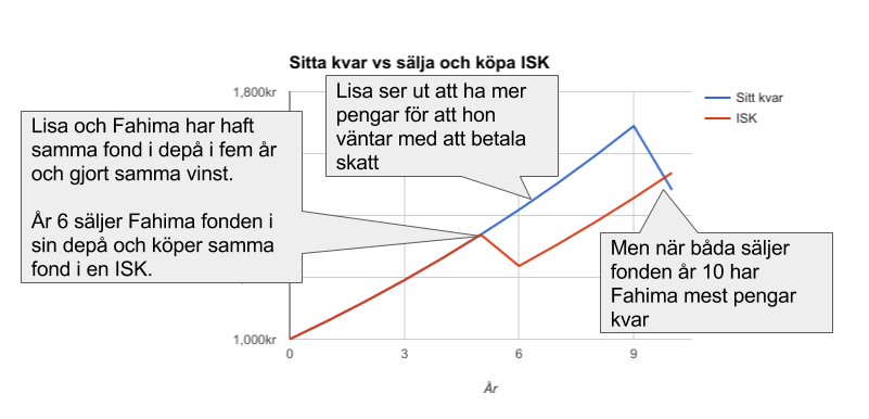 Vi är helt överens om att det nästan alltid är bättre att sälja gamla dåliga fonder som ligger i depå, betala av skatten och investera i väl diversifierade indexfonder med låg avgift som ligger på ett ISK-konto - vilket jag också skriver i mitt första inlägg ovan. Men det finns exempel när det absolut är lönsamt att ligga kvar i depå och utnyttja den hävstång som den obetalda skatten kan ge.
