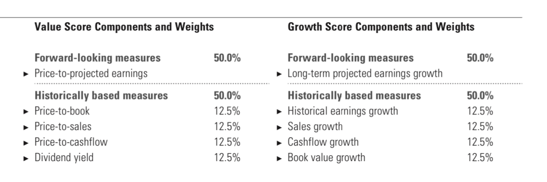Morningstar viktar efter följande parametrar när dom gör sin ”score” mellan värde/tillväxt: