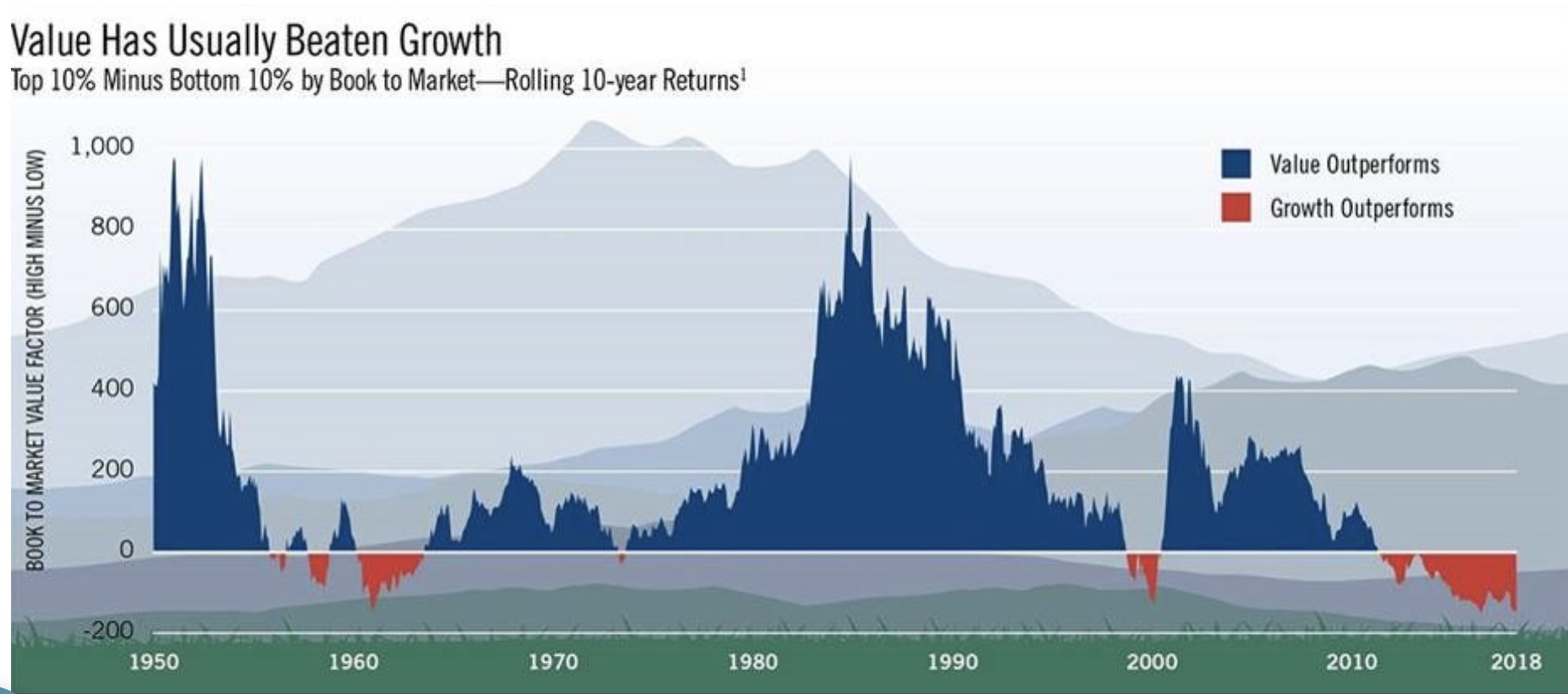 Men vad är ett ”högt” värderat bolag, och i förhållande till vad? Och framför allt, vad finns det för belägg att tro att värdebolag ska avkasta bättre än tillväxtbolag kommande 30år? Visst historisk har värdebolag presterat bättre än tillväxt, men senaste decenniet har tillväxt gått bättre.