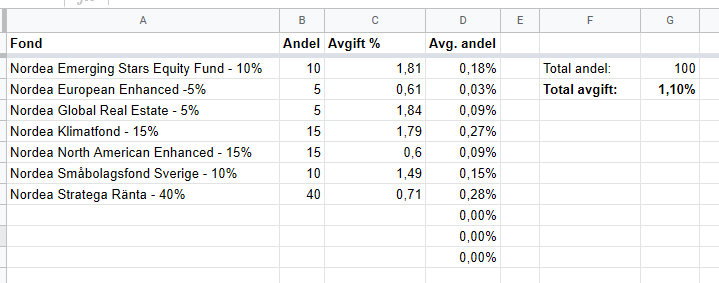 Överlag är jag skeptisk till Nordeas rådgivning då jag snarare ser det som försäljning än rådgivning. Flera av fonderna de har rekommenderat tycker jag har väldigt dyra avgifter.