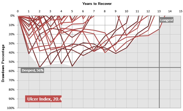Fast absolut avkastning i långa loppet är ju inte det enda som är viktigt (för alla). Hur mycket det svänger på vägen dit spelar också roll.