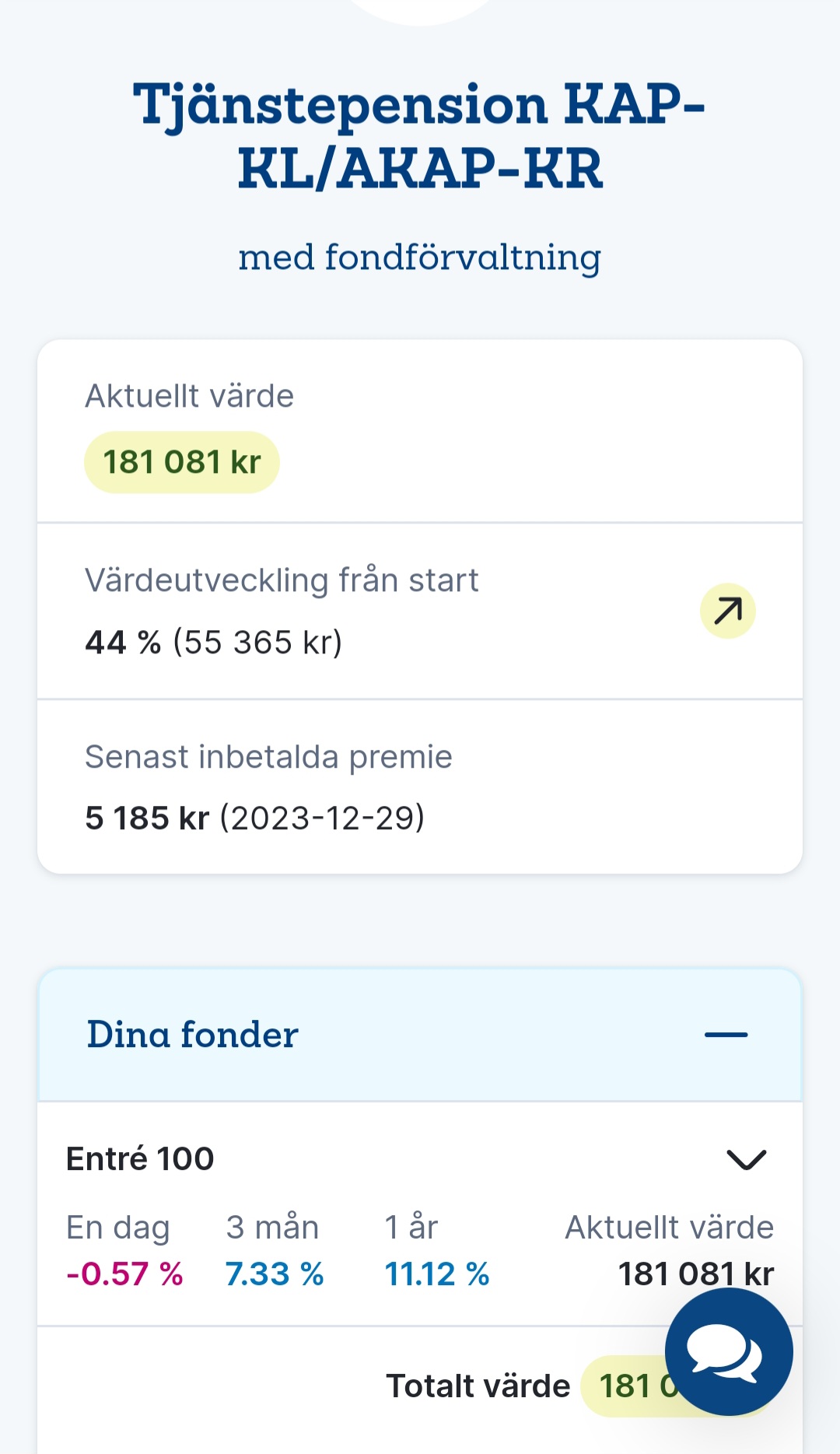 - Min tjänstepension har jag således AKAP-KR där jag har fondförvaltning med en värdeutveckling på 44% med fonden Entré 100. Kan jag välja att spara själv till detta via Avanza och är det isåfall något jag bör göra eller ska jag ligga kvar som jag ligger? Finns det någon annan fond som är bättre lämpad inom AKAP-KR? Se bild nedan.