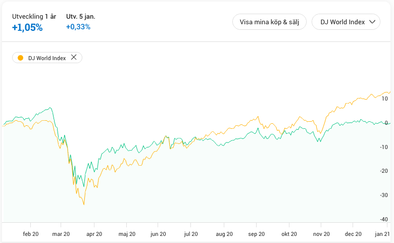Sedan november månad 2020 följer inte fonden med världsindex uppåt ens i närheten. Mer än 10% uppåt för index medan fonden knappt når upp till 1% på ett år.