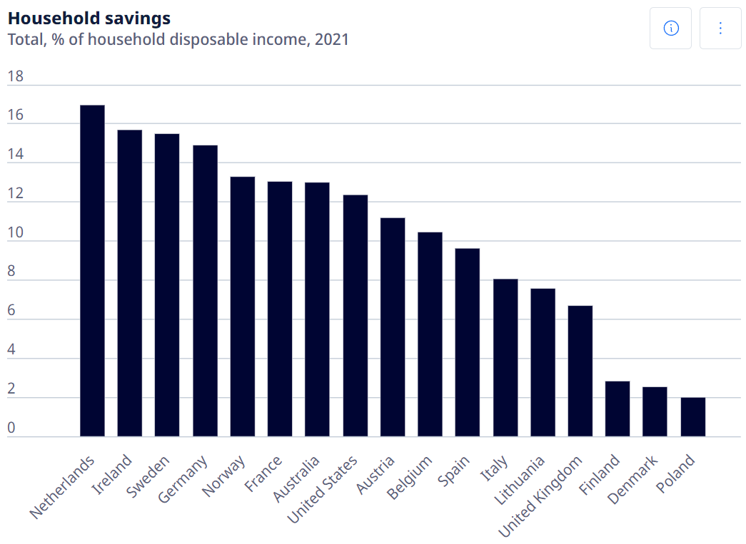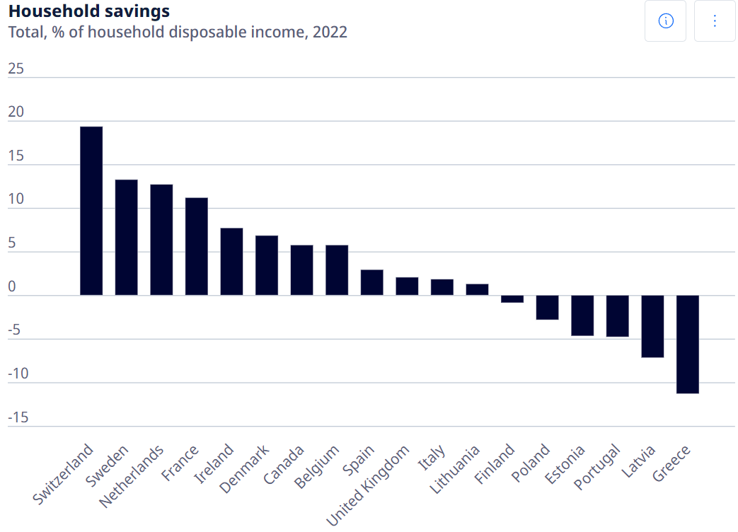 Lite på samma not kring jämförelse med andra länder så finns data att kika på från OECD, Household savings | OECD, Sverige ligger generellt nära toppen men man är lite seg med att rapportera in data från flera länder så 2021 är det senaste där vi har data för USA som vi diskuterade tidigare. Datan som presenteras här är inklusive “tvångssparande” till pensionssystemet vi har i Sverige.