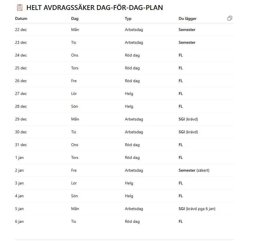 @Entropi: vi kände inte till detta med att det är mer fördelaktigt att ta semesterdagar under perioder med röda dagar, bra timing att vi såg denna tråden och kan göra rätt till jul! Min fru har varit ledig hela året, jag tar vid i början av nästa år, Jag antar att det är för sent att ändra dagarna i påskas, även om det går att ändra på försäkringskassan blir det svårt att rapportera in till arbetsgivaren nu i efterhand.