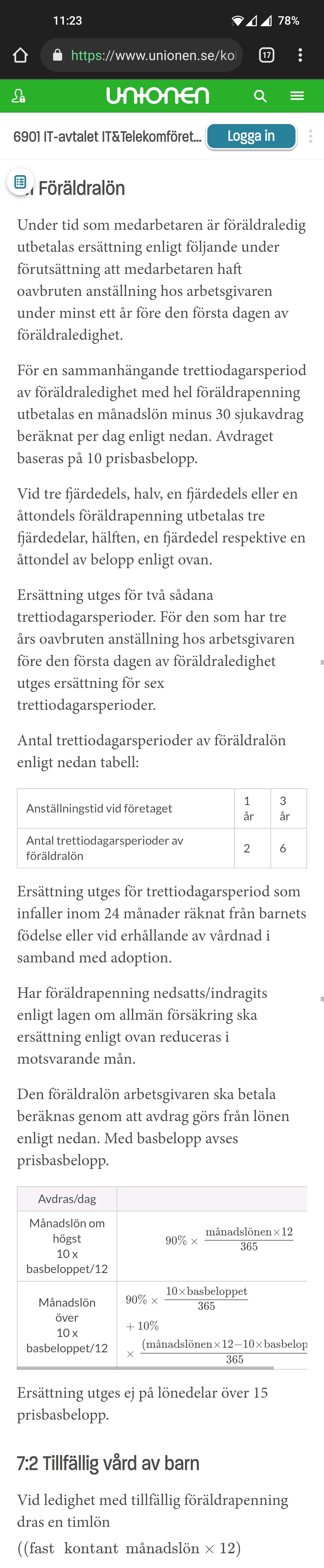 Meningen som jag hängde upp mig på var “För varje föräldraledighetsdag inklusive arbetsfria dagar görs avdrag enligt följande…”.