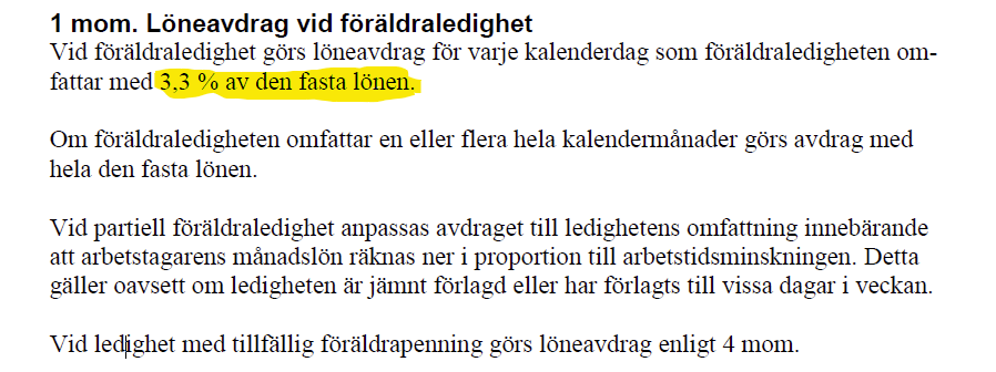 Ex, statlig sektor 3,3% Löneavdrag per ledig dag samt föräldralön på dagslön.