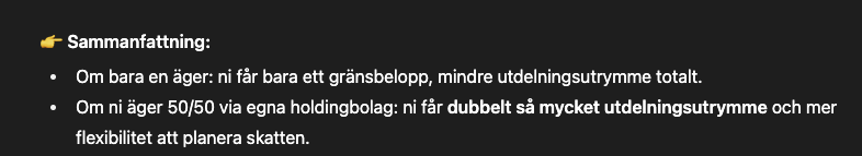AH, bra poäng med 3:12 reglerna, det där kan jag så lite om. Jag frågade min polare GPT. Är det här rätt? Just i år har vi nog väldigt lite vinst, men om vi “befarar” vinst nästa år, kan det ju vara värt… Hur krångligt skulle du säga att det är att ha varsitt holdingbolag? Någon “magisk” finansiell gräns där nyttan överstiger jobbet?