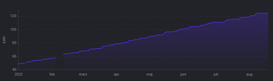 Jag har hittills inte hittat någon mätare som kan mäta värmepumpen eftersom den har en så pass hög effekt när den kör igång. Den kan lätt på egen hand dra 10 - 15 000 W. Jag hittade Aotec Heavy Duty Switch - köpte den, fick tag på en elektriker som ska installera den men som konstaterar att värmepumpen är tre-fas och den mätaren var en-fas, så det gick inte. Därefter fick även reda på från tillverkaren att den max klarar 9 600 W. Så jag har faktiskt egentligen ingen mätning på värmepumpen annat än indirekt (dvs. total förbrukning - basförbrukning)