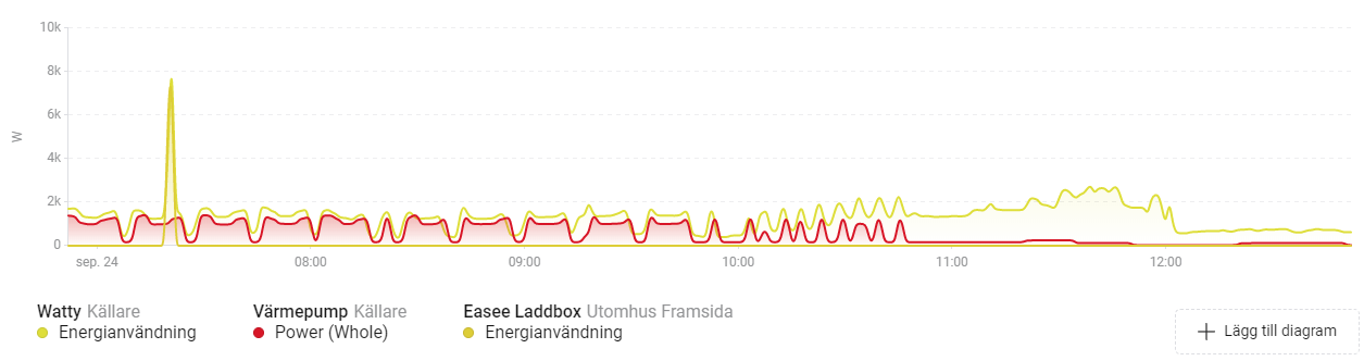 Installerade med hjälp av @MatsL (tack för hjälpen) en extra energimätare bara på värmepumpen. Den gula linjen är total energiförbrukning via Watty / Pulse och den röda är bara värmepumpen.
