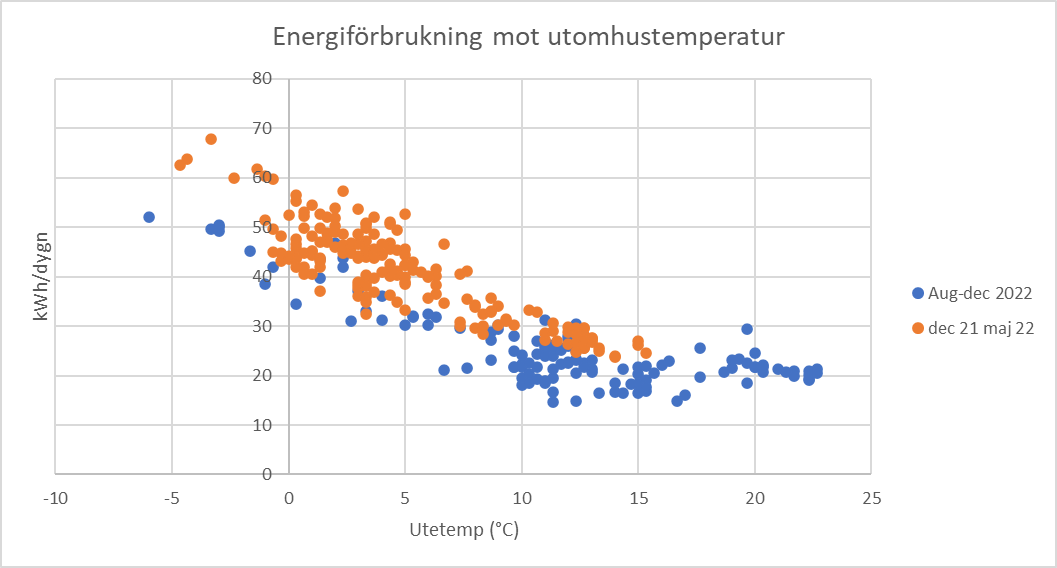 Roade mig att plotta rullande 3 dygnsmedelvärde för dygnsförbrukning vs utetemp (data från Eon så jag vet inte hur akkurat temperaturen är men tror inte det skiljer så mycket) och det är lite tunnt med datapunkter vid låga temperaturer (men det ser ut som det ändrar sig denna vintern…)
