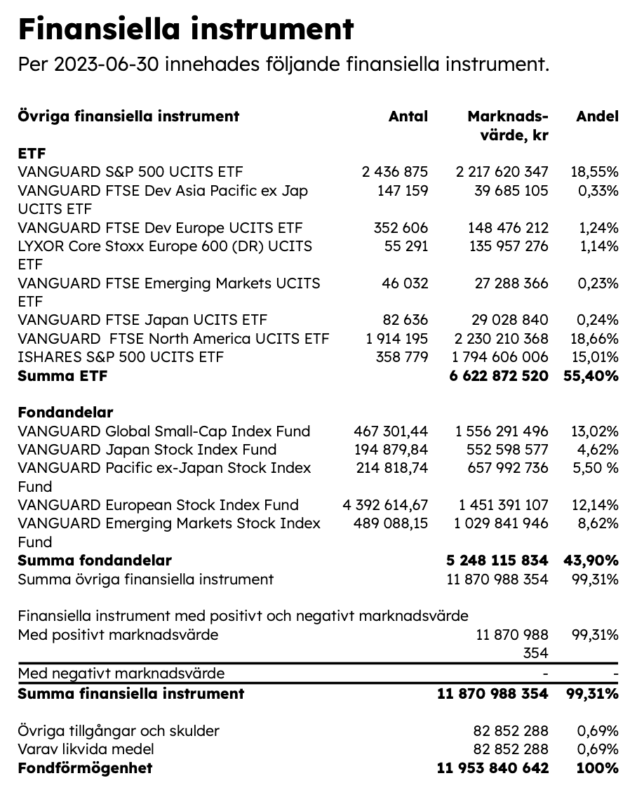 För att bryta ner detta ytterliga. 58.36% stora bolag kan vara LF global/DNB index, 8.62% EM kan vara Avanza EM och 13.02% små bolag kan vara Handelsbanken GI småbolag samt 20% Sverige kan vara Plus allabolag Sverige Index?