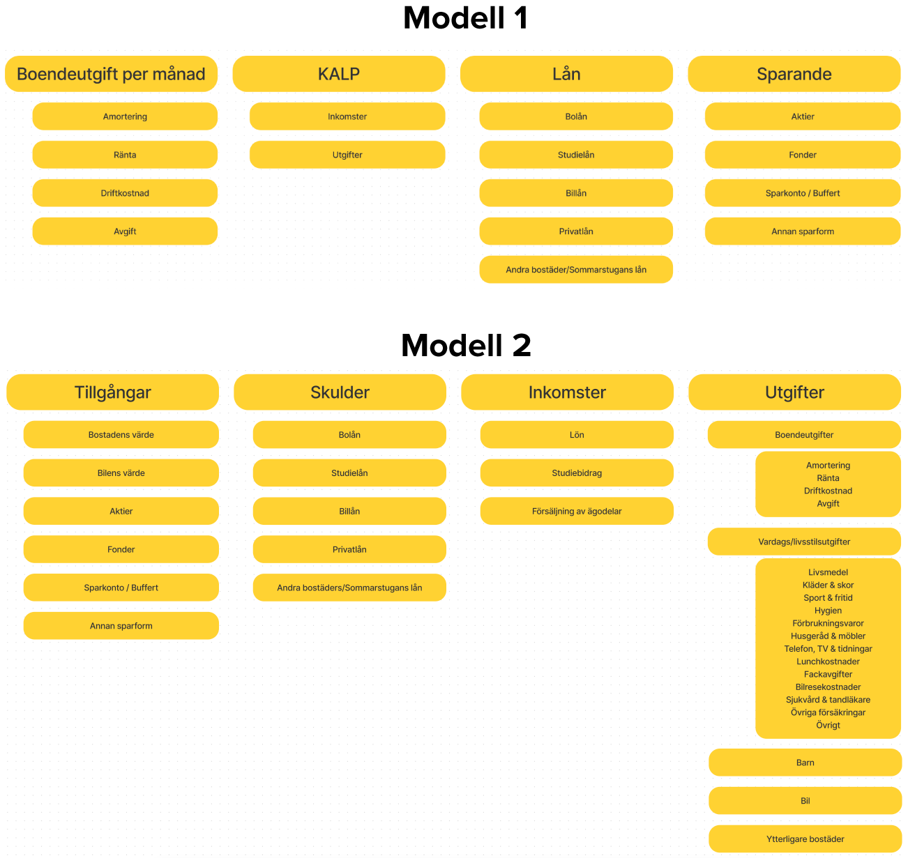Hejsan! Jag kikar på vilket sätt jag bäst får en fullständig koll på min privatekonomi och hur jag kan sammanställa den tillsammans med min flickvän inför vårt första bostadsköp. Hon är inte jätteintresserad och det kan behövas fika som muta och lite pauser för att vi ska ta oss igenom hela ekonomin. Därför behöver det vara enkelt, lättbegripligt, men ändå tydligt och korrekt. Just nu väger jag mellan två olika modeller, men kom gärna med förslag på andra modeller om ni har andra förslag!