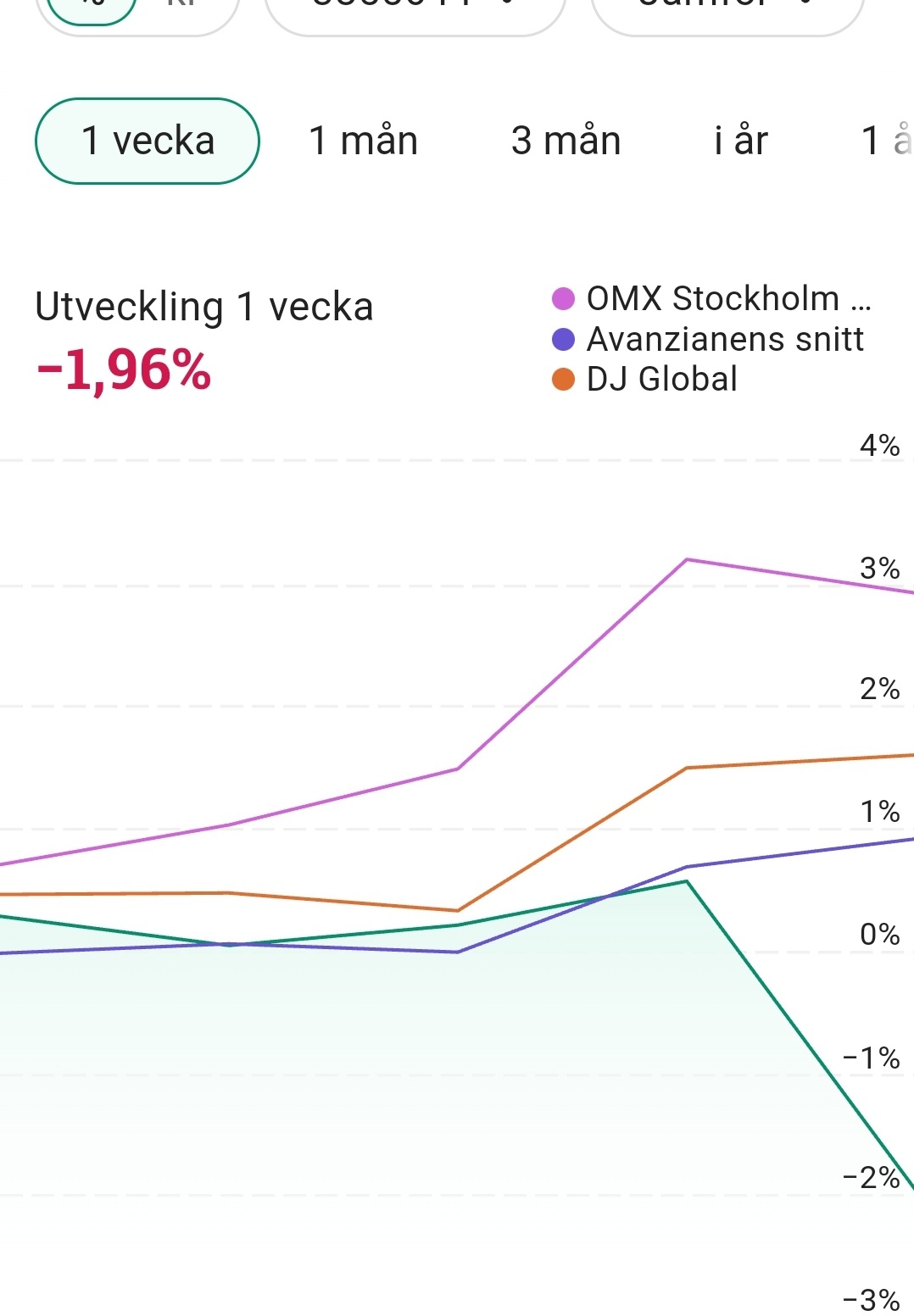 Alright, rimliga förklaringar, men det förbryllar mig att både USA och sverige och alla andra övriga index jag har är upp i veckan, men jag är ner 2 %? Valutafluktueringarna har väl inte varit så höga heller. Det är första gången jag är med om en så radikal diff från index och hittar inget innehav som förklarar det