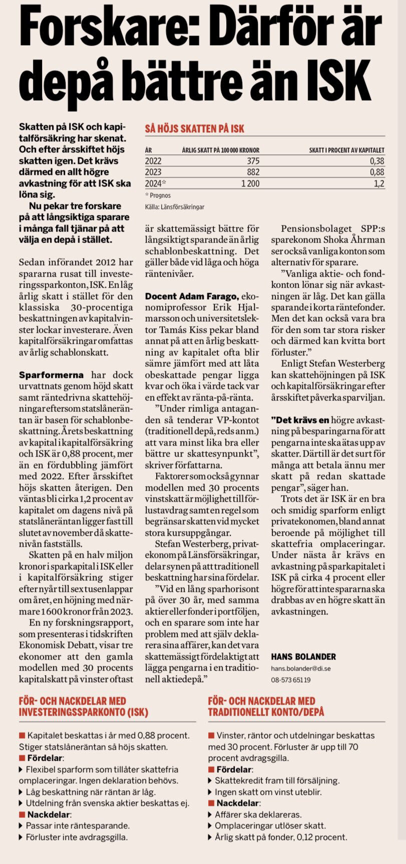 Tyckte det var värt att dela denna artikel här då det brukar finnas lite debatt kring fördelar och nackdelar med ISK och ett vanligt aktie- och fondkonto. Så om räntan är låg är det värt att köra med ISK, men i sådana här tider när räntan på ISK stiger och kommer stiga ytterligare under 2024 får man ställa sig en funderare kring om det fortfarande är värt att investera stora delar av sitt sparkapital på ett ISK över ett aktie- och fondkonto. Personligen kommer jag att fortsätta investera och känna av läget under de närmsta åren, skulle tiden därefter visa att vi inte kommer tillbaka ner på sunda räntor på ISK så blir det potentiellt en flytt till ett aktie- och fondkonto. Värt att notera är att ju längre tid man har kvar på börsen, desto värre blir det ur skattesynpunkt med att investera på ett ISK.