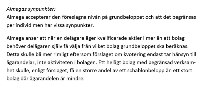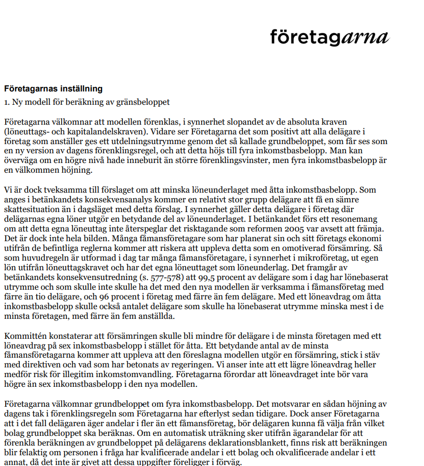 - Almega och Skattedelegationen framhåller det vi tagit upp innan: att ägaren själv ska få välja hur grundbeloppet ska fördelas.
