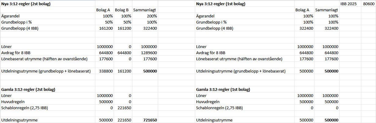 Det placerar mig i en lite klurig situation inför de nya reglerna. För inkomståret 2025 så kommer jag att ta ut utdelning enligt löneregeln i verksamhetsbolag 1 och utdelning enligt schablonregeln i verksamhetsbolag 2 - men hur ska jag göra inför nästa år?