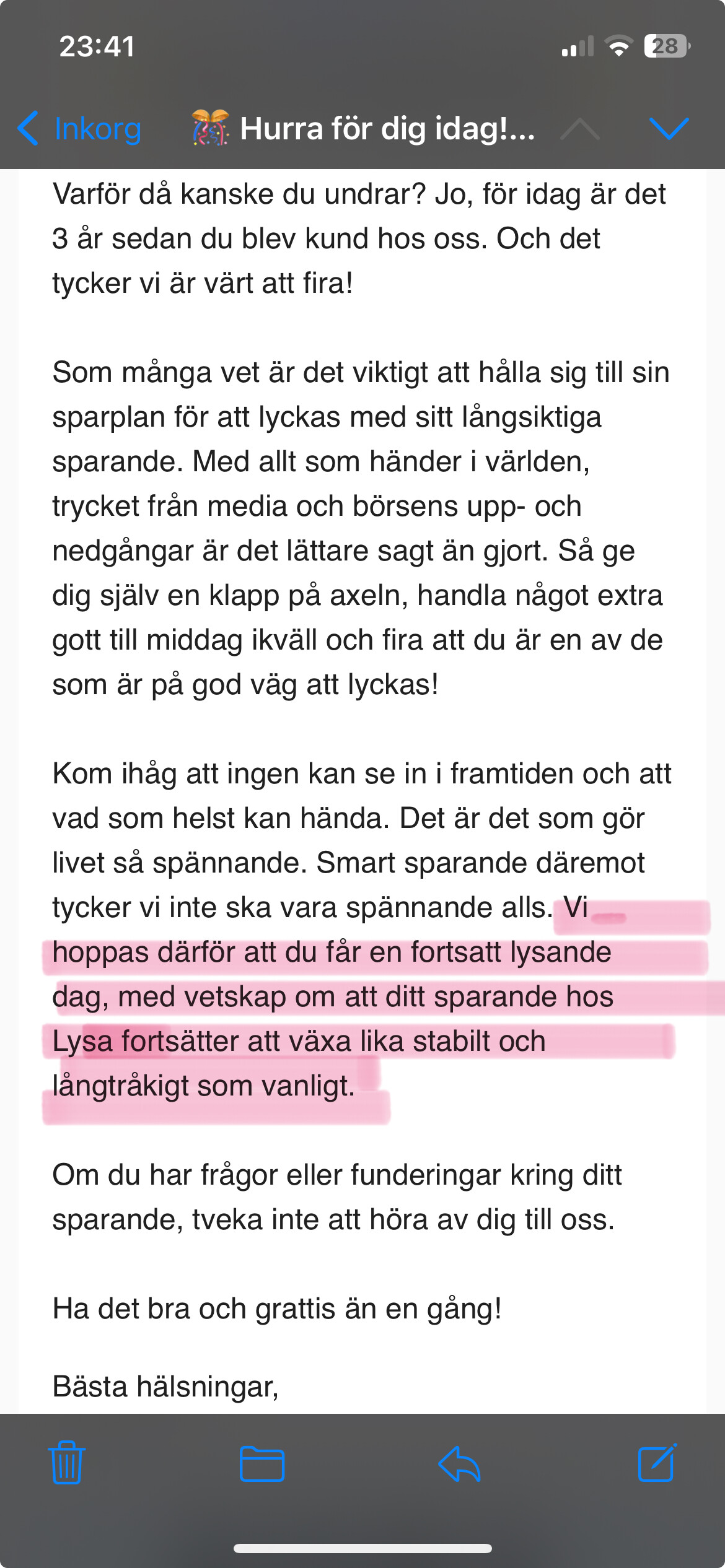 Haha har inga tips förutom global indexfond med låg avgift. Såg att det var för tråkigt för dig. Själv har jag lysa just av den anledningen fick detta mailet från Lysa, sammanfattar det bra