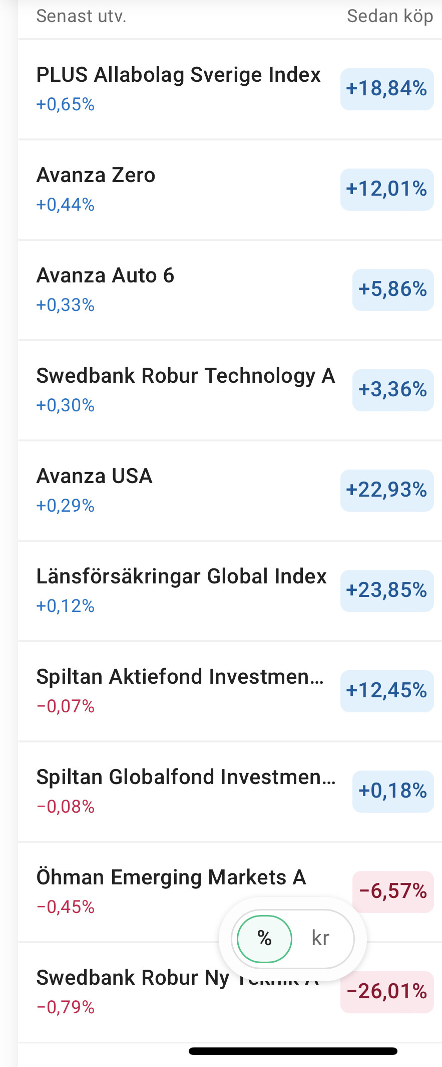 Nu när man ser att milstolpen till första miljonen på Avanza är nära skulle jag vilja ha lite tips om min fonportfölj som kanske är lite spretig, ska man behålla Ny teknik som gått ner rejält? Sparhorisont är långsiktigt. Utöver listan nedan har jag också Bitcoin BTC som gått upp ca 40%, inga större pengar där.