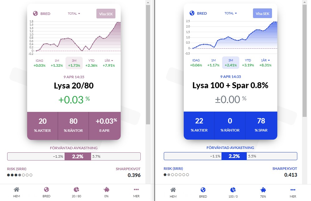 För Lysa 20/80 har du högre volatilitet/risk (vilket både syns på kurvan samt bekräftas av Sharpekvoten) och lägre historisk avkastning (förutom under senaste månaden)