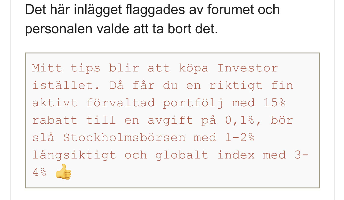 Jag utgick från Princip 2) “Utgå från att ingen är dum i huvudet” när jag skrev inlägget. Det var ett tips, och jag skrev att det var ett tips och bör överavkasta en global fond och inget annat. Men gick tydligen bet där då…