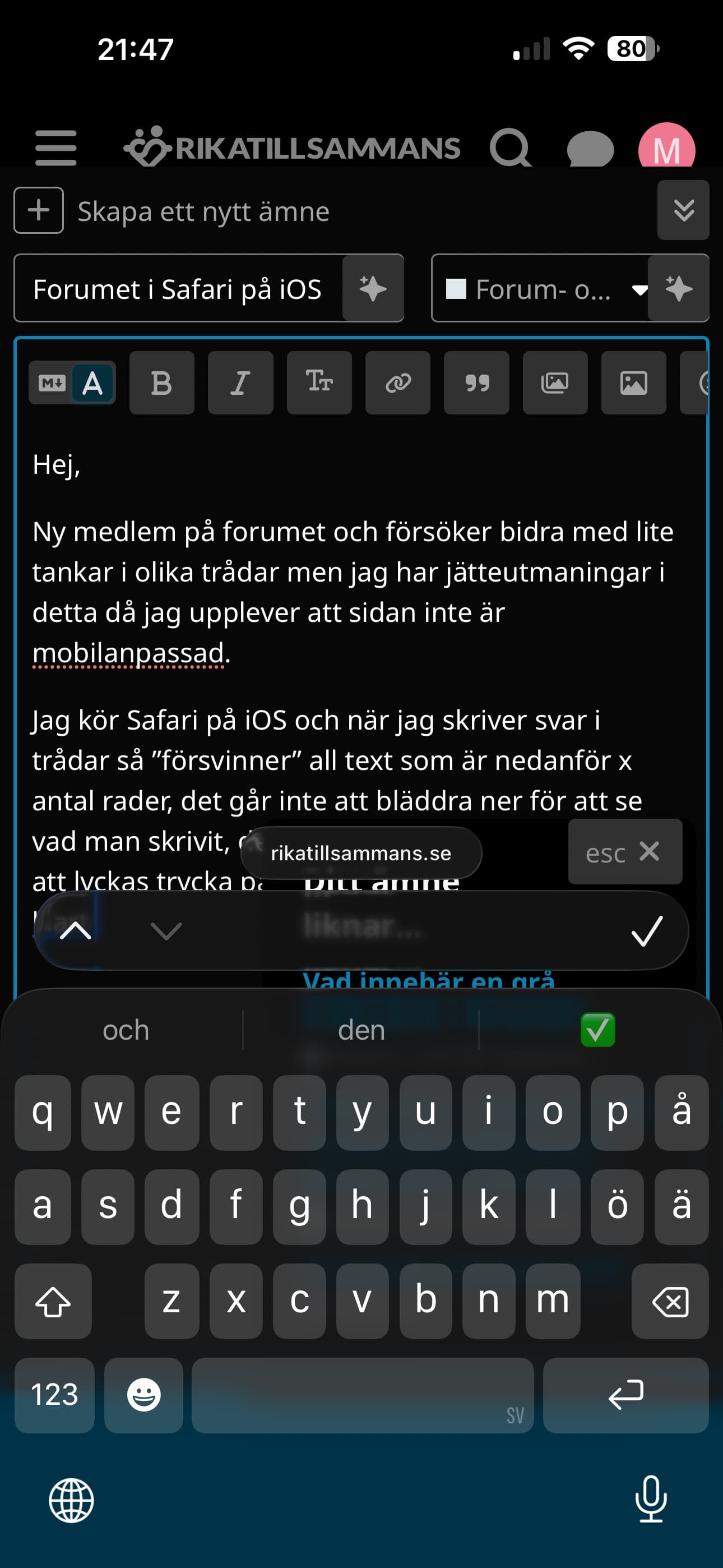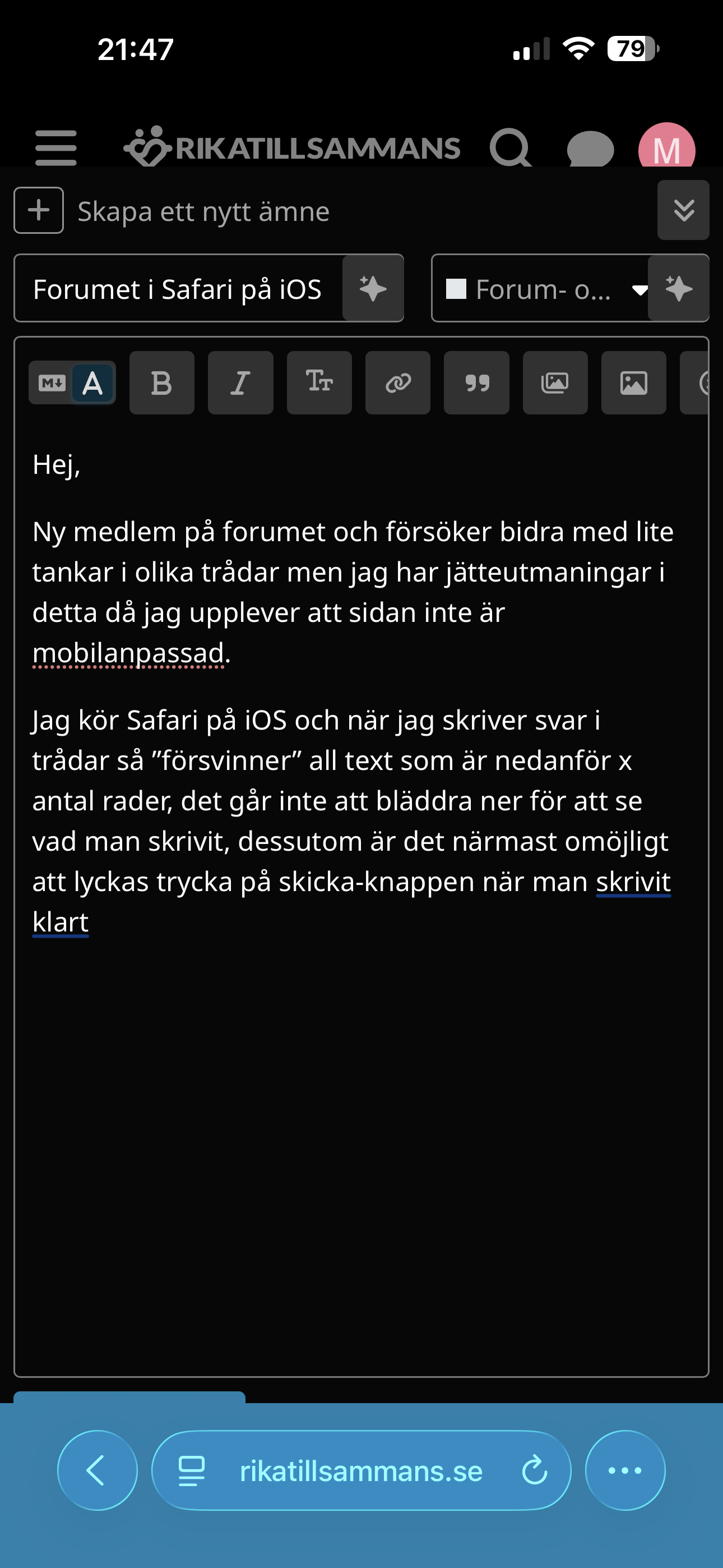 Jag kör Safari på iOS och när jag skriver svar i trådar så ”försvinner” all text som är nedanför x antal rader, det går inte att bläddra ner för att se vad man skrivit, dessutom är det närmast omöjligt att lyckas trycka på skicka-knappen när man skrivit klart .