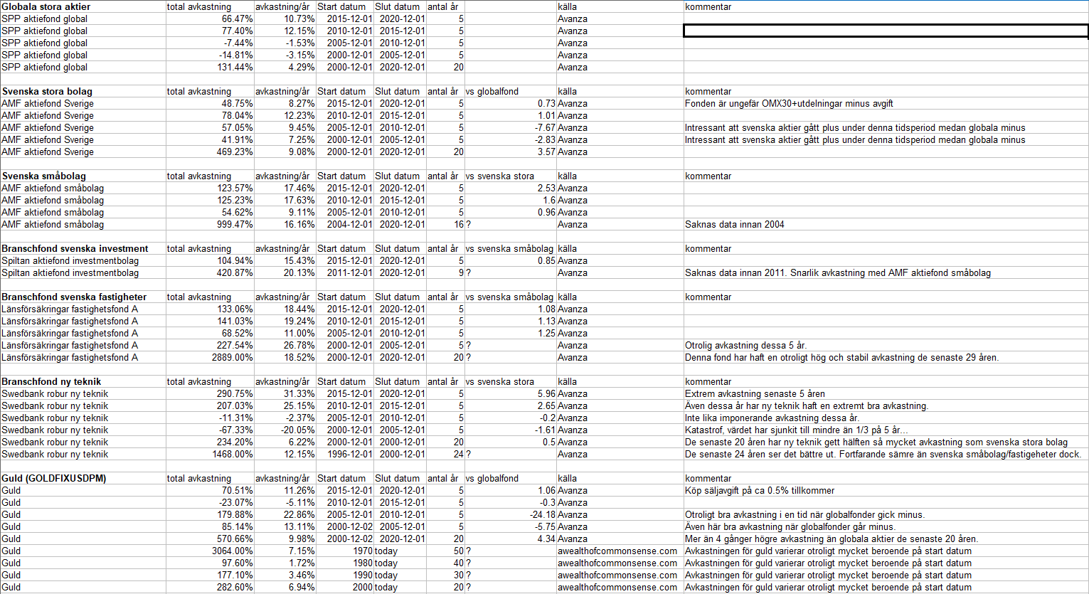 Jag har nu tagit historisk avkastning istället för gissad avkastning för ett antal tillgångsslag. Jag hittade ingen bra data för olika index så jag har helt enkelt valt ut ett antal fonder som får repersentera olika index, håll till godo: