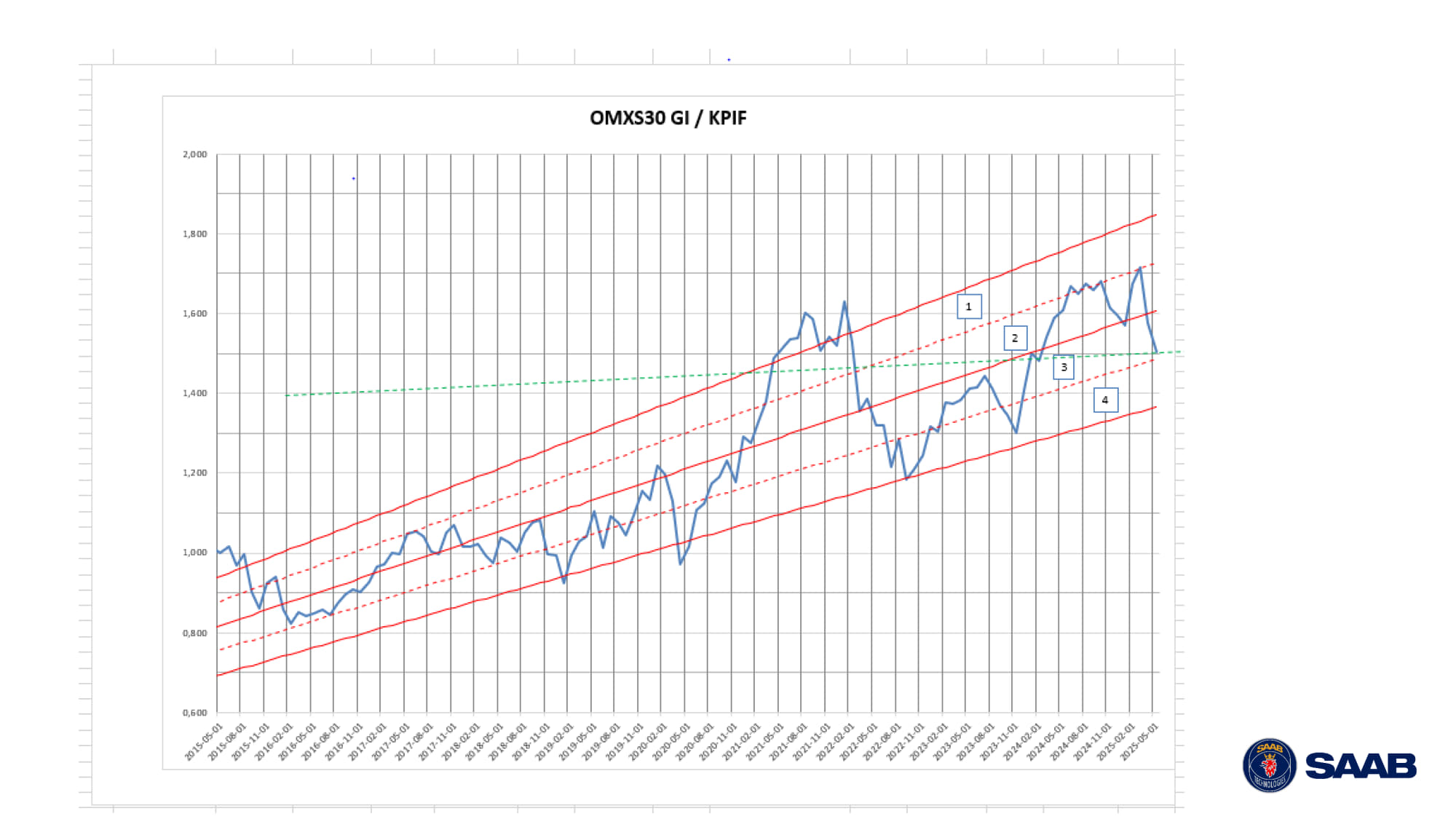 Den blå kurvan i grafen nedan är just OMXS30GI normerat med KPIF. Tidsfönstret är de senaste 10 åren. Den röda linjen i mitten är en rätt linje som minsta kvadratanpassats till den blå kurvan.