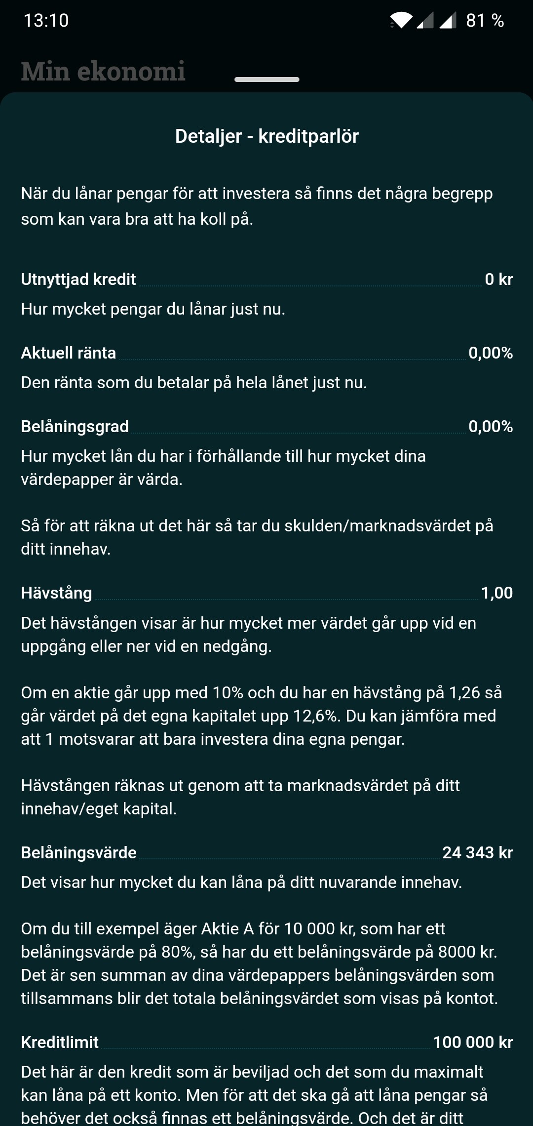 Är så sjukt förvirrad över vad allt betyder här. Det verkar ju som att jag använt kredit men min skujld är 0? Eller skulden byggs inte på förrän jag går över 10% belåning?