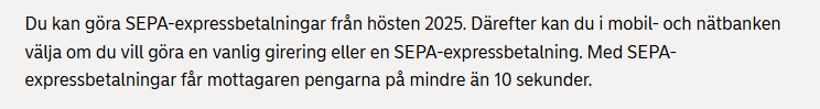 Däremot måste alla svenska banker kunna ta emot RIX-Inst betalningar sedan nov 2024. Idag finns inget datum för när bankerna senast måste erbjuda möjligheten att skicka RIX-INST betalningar. Däremot när det kommer till SEPA- Inst betalningar i EUR det måste svenska banker erbjuda senast 2027 till sina kunder.
