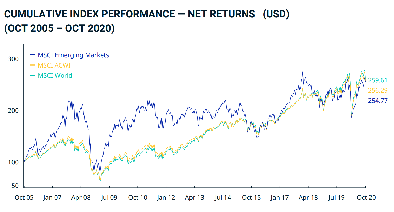 Tittar man på MSCIs index så ser man ju att tillväxtmarknaderna, dvs. blåa kurvan, helt klart spretar desto mer än i-länderna, dvs. gröna/turkosa kurvan. Tittar man på marknadesviktat ACWI, dvs. gula kurvan, så är ju skillnaden ganska liten gentemot dengröna. Det har funnits perioder när det ha varit fördelaktigt att ha med tillväxtmarknader, och det har funnits perioder när det inte har varit det.