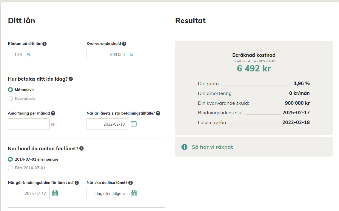 Stämmer det ungefär eller är jag helt ut? Lek med tanken att jag skulle teckna ett lån idag, på 3 år, för 1,96% ränta (räntan har stuckit rätt bra senaste månaden på SBAB tycker jag), är jag ungefär rätt ute om jag får betala en kostnad på ~6500 kr om jag skulle lösa det idag? (Gick inte att “simulera” ett år i framtiden.