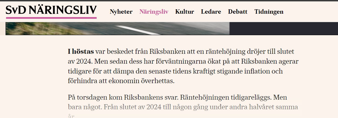 Fråga 2. Bostadsmarknaden. För att spinna vidare på fråga nummer 1; hur reagerar bostadsmarknaden på inflationen? Riksbanken sa häromdagen att styrräntan kommer vara oförändrad till 2024, dock vet jag inte hur mycket man kan tro på det. Se bild nedan från SvD: