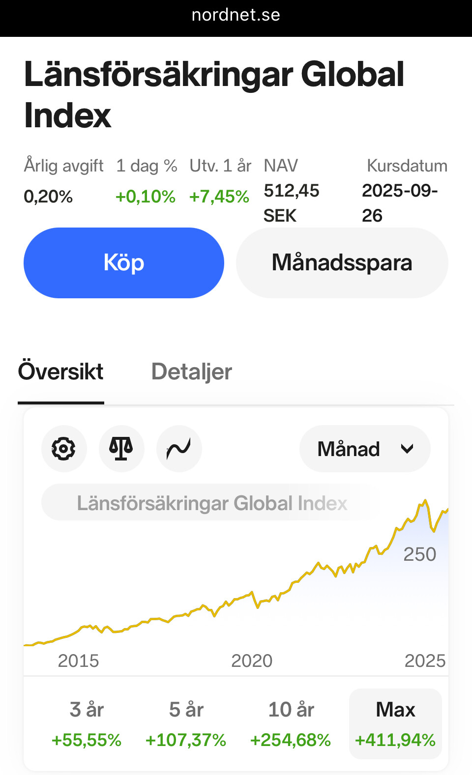Om vi tar LF global som exempel, sen fonden startades 2013 har den gått upp 411%. Så den typen av fonder är något man köper och behåller fram till man behöver pengarna. I alla fall jag tänker så.