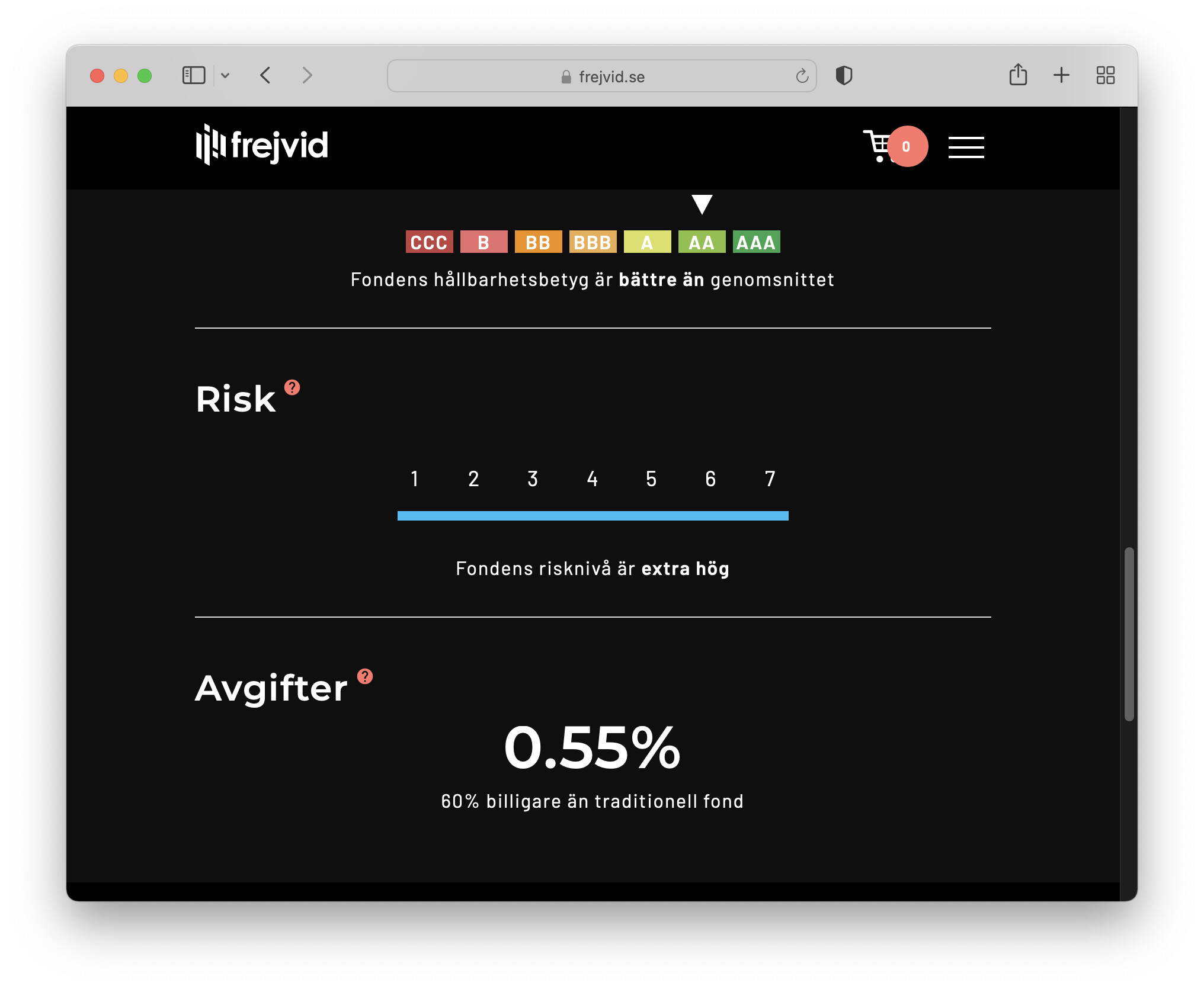 Jag tycker dock de kan vara mer tydlig med avgiften. De skryter om hur mycket billigare de än en traditionell fond, men för att förstå att man betalar 0.15% courtage och 0.25% valutaväxling vid köp samt sälj måste man klicka på det pyttepyttelilla frågetecknet till höger om “Avgifter”.