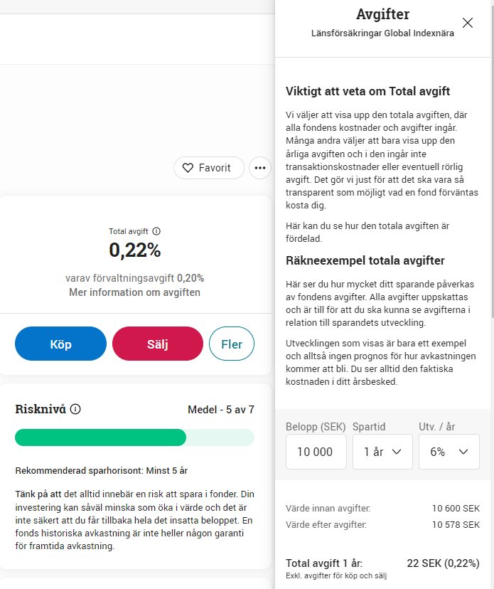 Avanza är bra på att presentera hela fondavgiften. Exempel nedan.