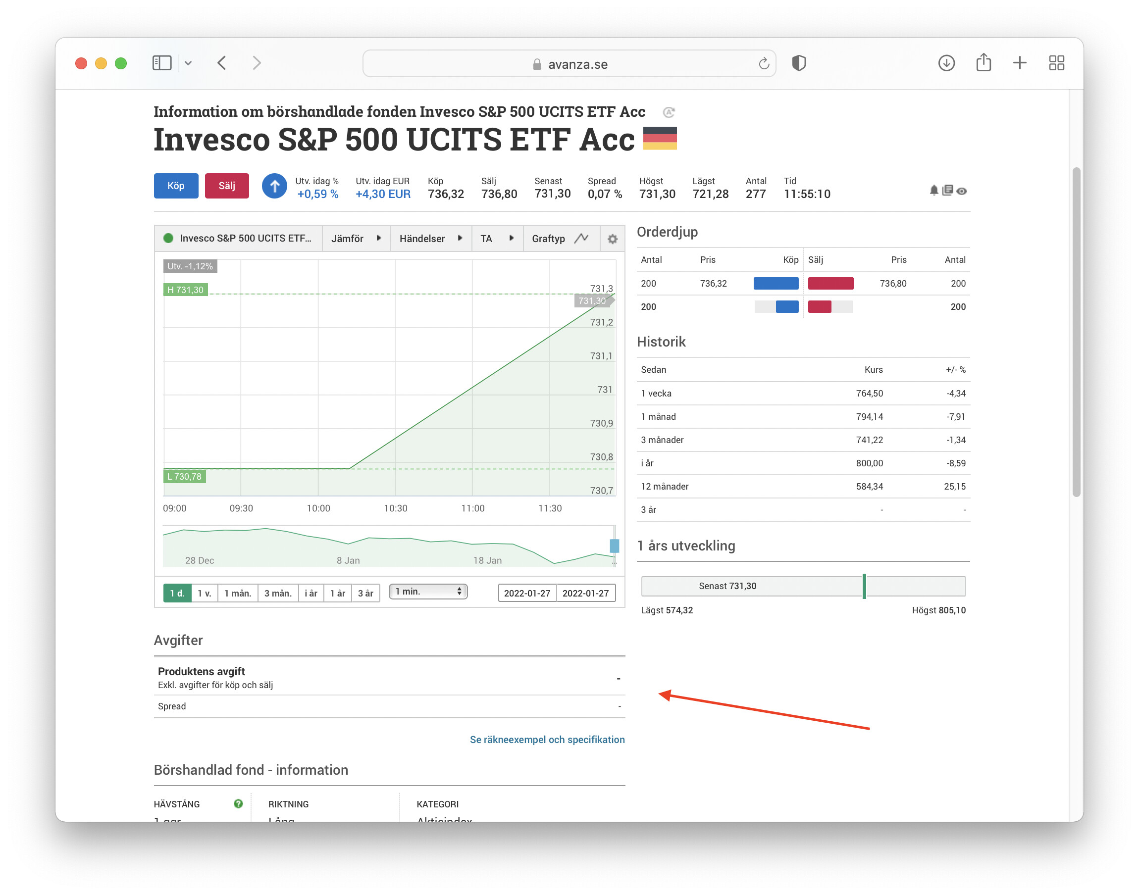 Jag klickar på en ETF (och jag väljer ingen obskyr ETF, utan jag väljer en Invesco S&P ETF) och ser följande. Noll information om avgift på denna sida.