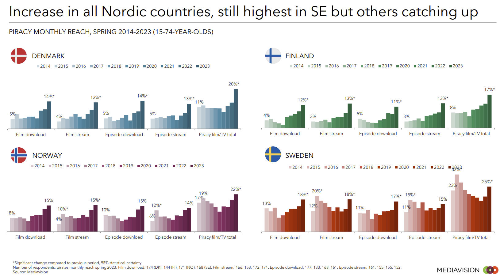 A Mediavision survey reports a sharp rise in piracy rates across the Nordic region. Movie and TV show consumption, whether streamed or downloaded, is up in Sweden, Denmark, Finland and Norway. The largest number of pirates can be found in Sweden, where a quarter of 15 to 74-year-olds pirate content, levels last seen in 2016.