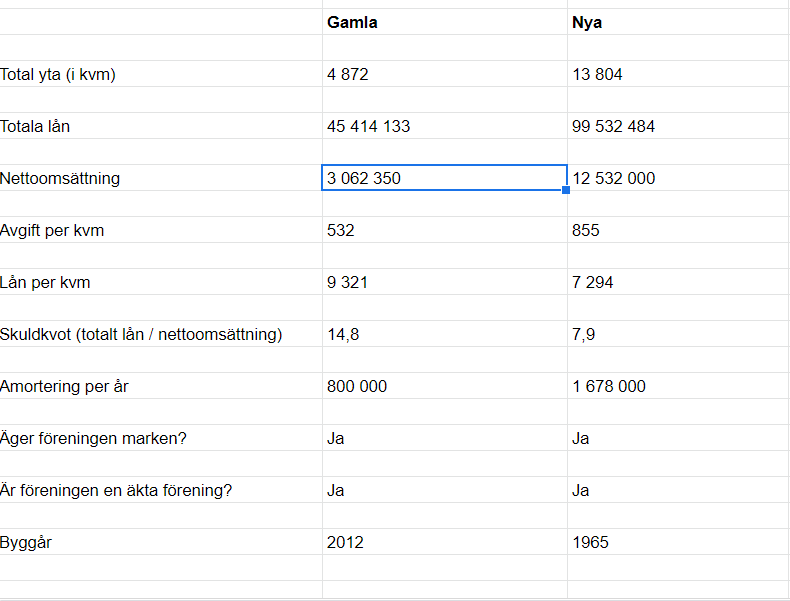Innan hade BRF:en (den som har 13804 kvm i total yta) en skuld på 300 kr / kvm och var i princip avbetald, så det är en väldigt bra förening. Nedan är ett utdrag från “allabrf” som jag köpte: