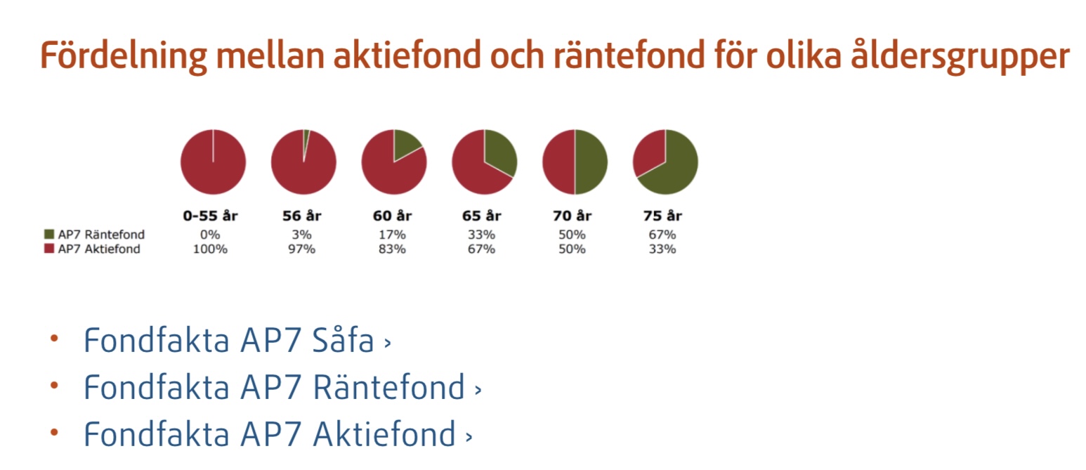 Jag har en fråga angående pension. Man brukar räkna att man tar lägre risker destu närmre pension man kommer. Oftast då mindre andel aktier och då med mindre förväntad avkastning.