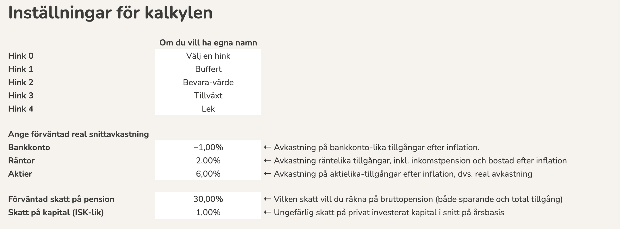 Några reflektioner: väldigt användbart att få översik av nyckelvärden bredvid varandra på så övergripligt och lättförståeligt sätt - bonuspoäng för kommentarerna som ger en slags indikation på “hur det går” och vad man ska tänka på. Några saker som jag själv fick stor behållning av var att faktiskt systematiskt gå igenom vad min spar-% var per år och få min mellan tummen och pekfinger-uppskattning bekräftad, men också hur många % som jag faktiskt över ett års tid ökar min förmögenhet med. Pluspoäng att det också gick att nolla standardvärden kring pension för oss som är lite aviga på den fronten.